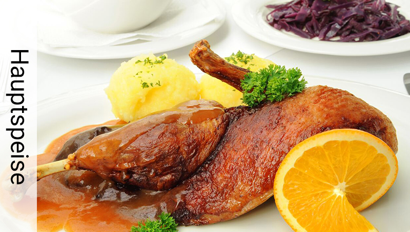 Caraffini's Gänsebraten€ 23,00Knusprig gebratene Gänsebrust und -keule, dazu servieren wir Apfelrotkohl, Rosenkohl und Kartoffelklöße