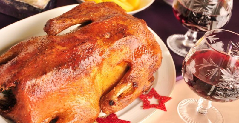 Knusprig gebratene Gänse am Tisch tranchiert,